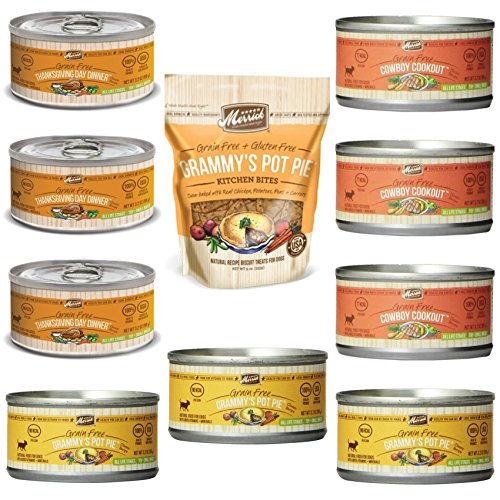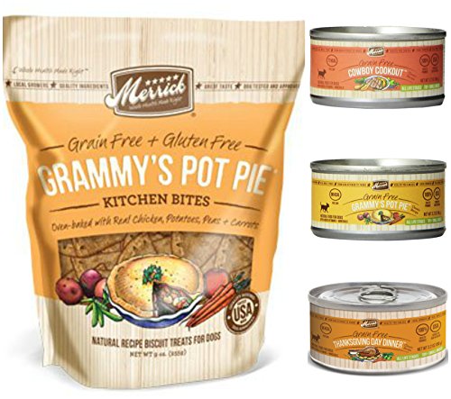 -. Feature : Includes 3 cans of Grammy's Pot Pie, 3 cans of Cowboy Cookout, and 3 cans of Thanksgiving Day Dinner (9 Cans, 3.2 Ounces Each) PLUS a 9-ounce bag of Merrick Grain Free Kitchen Bites Granny's Pot Pie Dog Biscuits -- 10 Items Total / Real deboned meat is the first ingredient in both the canned dog food and the treats / Merrick Grammy's Pot Pie Kitchen Bites dog biscuits -- oven baked with real beef, potatoes and carrots / Grain free and Made in USA / 9 Cans Total (3.2 Oz Ea) PLUS 1 Bag of treats (9 Oz) = 10 ITEMS TOTAL