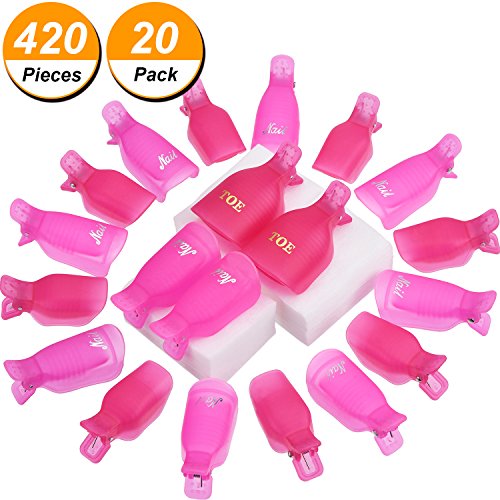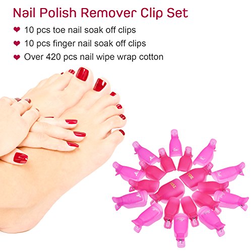 Nail remover clip set: includes 10 pieces nail soak off cap clips for fingers and 10 pieces for toes with 420 pieces polish remover cotton pads