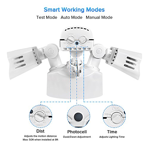 AUTO ON AND OFF: Dusk-to-dawn photocell activates at nightfall and powers off in the daylight. Auto-on when motion is detected in the night, auto-off after pre-determined time when no further motion is detected. Sensing light levels and motion are with a range of 180 degrees and out to 50 feet when being wall mounted 8 feet high.