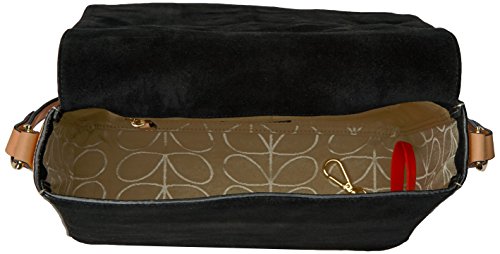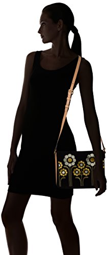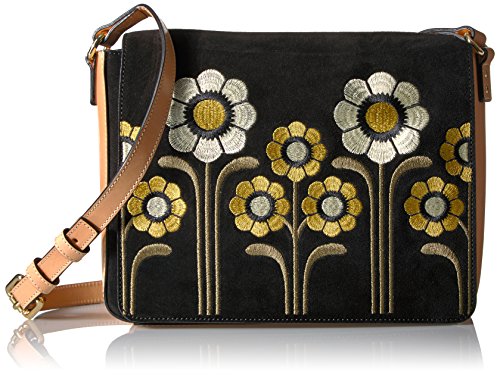 Suede embroidery' rosemary bag with feature sunflowers embroidery on front flap. Magnetic closure. Adjustable leather shoulder strap. Gold colored hardware. Inside details include sand linear stem jacquard lining, slip pocket and elastic key chain