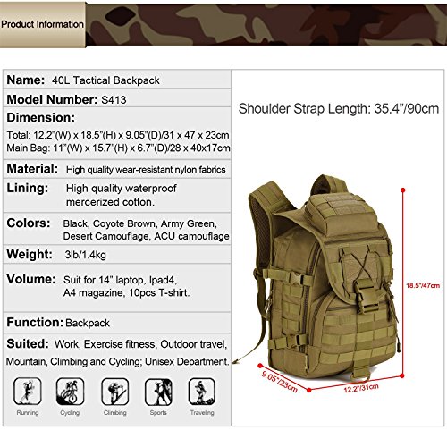 Studio : My case diy store Publisher : My case diy store Product Description Structure 1.Exterior: Three zipped front pockets,Card Buckle Closure Package Cover,Cover with Two zipped pockets 2.Interior: Four open pockets,One Magic pocket 3.Outer Material: High Strength Abrasion Nylon Inner Material: Waterproof Silky Cotton 4.Back: Thicken Breathablec Sponge 5.Hardware: Metal Lengthen the Rope Pull Head 6.Adjustable Long Shoulder Strap: Military Nylon Fabrics Unremovable Shoulder Strap 7.Chest Sliding Control System Measurements 1.Dimensions: 12.2"W x 18.5"H x 9.1"D Front Pockets: 8.3"H x 12.2"W 2.Shoulder Strap Drop: 13.8"-33.1" Shoulder Strap Width: 3" 3.Pocket size: (Zipped front pocket): 13.6"H x 7.8"W 4.Weight: 2.7lb Features 1.Suitable for fitness, outdoor travel,hiking, and other outdoor activities. 2.Chest sliding adjustment system can quickly adjust to their comfortable state,so that more comfortable Backpack. 3.MOLLE external expansion system designed to be used in combination with other equipment,you can load pockets¡e?water bottle bag,accessory kits and other. 4.The bag works well with a variety of different outfits and casual styles. Notes 1.Care: Hand wash with cold water. 2.Tolerance: 0.39"-0.79". 3.Packing List: Tactical bag x 1. 0
