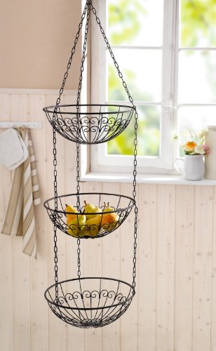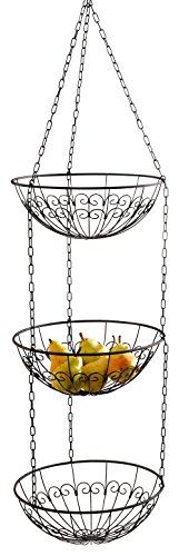 [Product Information]- Made of strong wire with subtle vine pattern in a modern dark brown finish, this 3 tiered hanging basket saves precious floor space while providing neat organization for fruits, vegetables, towels, or anything you feel like. It adds style and storage instantly to your kitchen, bath, laundry, or ANYWHERE in the home. Each basket is 12" Dia., 45" overall hanging length.