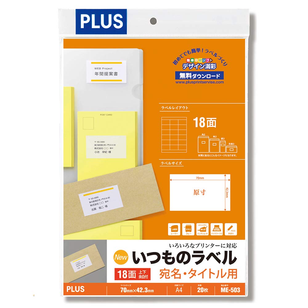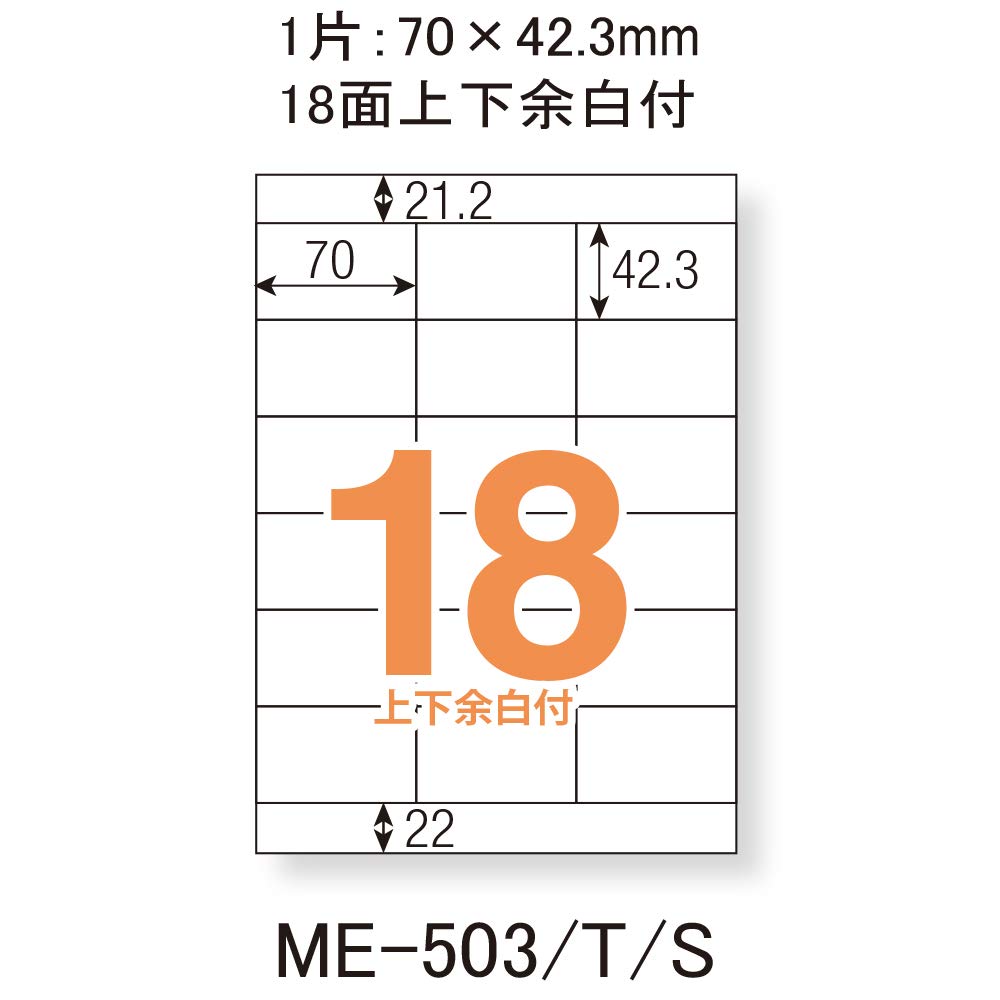 FSC認証紙を採用。「適切に管理された森林」に由来する製品であると保証された「環境配慮型の商品」。 宛名・住所・商品・ロゴ・タイトル・収納内容・値札表示などに 規格:A4 18面上下余白 一片:70×42.3m 数量:20シート入(18×20=360片入) 紙厚:総厚:124µm(0.124mm)、ラベル厚:71µm(0.071mm)、ラベル坪量:70g/㎡