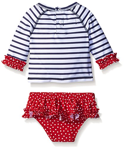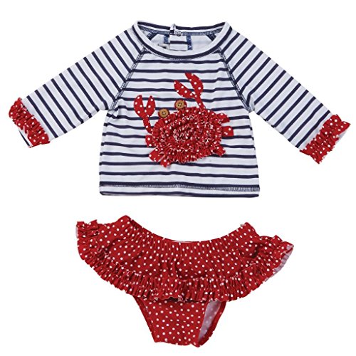 Nylon spandex rash guard with ruffled cuffs and back snap closure features dimensional polka dot crab applique with button eyes.