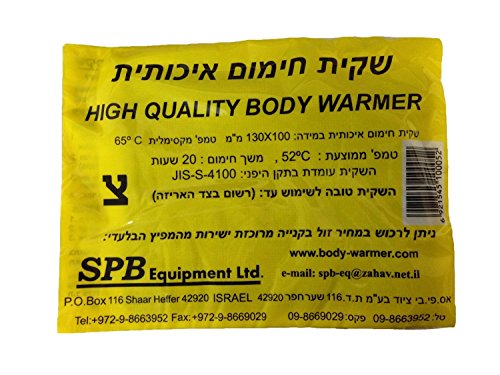-. Feature : High Quality Pack of 5 Body Warmer (heat bag). / Average temperature 125ºF, maximum temperature 150ºF. / Heat duration: 20 hours. / Each body warmer size: 5"x4". Conveniently fits in your pocket, pouch or sleeping bag. / Compliant with JIS-S-4100 Japanese standard and used by the IDF (developed specifically to the IDF's requirements).