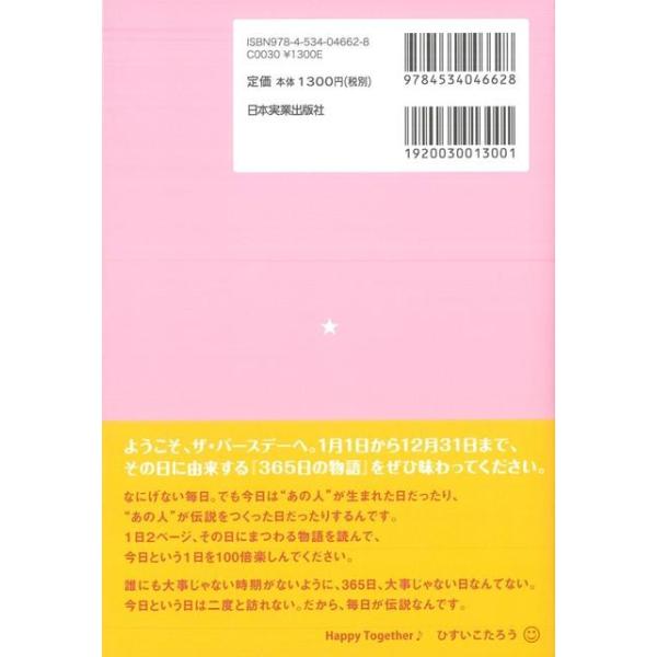 【商品説明】 定価(税込み):1,404円 値引き:10% OFF 累計100万部超の強力コンビが、【誕生日】(その日に生まれた著名人)【記念日】を切り口に、366日(2月29日含む)にまつわる、感動・気づきを得られる深い話を紹介!1話2P完結。今日誕生日の人・出会った人を書くスペース付。1?6月を収録。 バーゲンブック 新品 特価 格安 エンターテインメント 雑学 | |