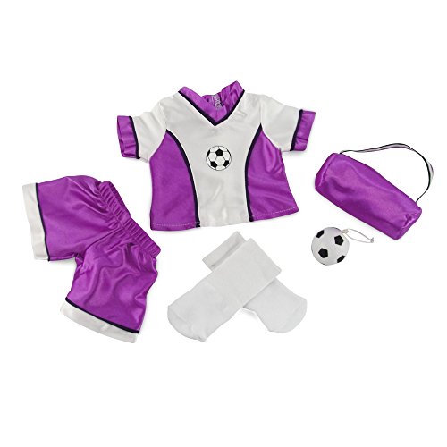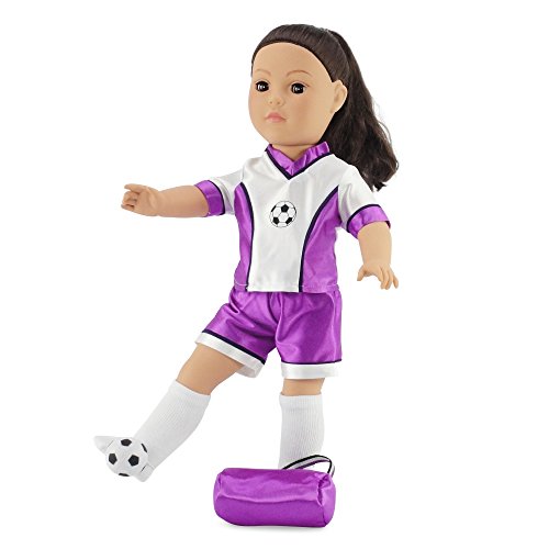 -. Feature : Made to fit 18 Inch dolls such as American Girl, Madame Alexander, Our Generation, etc. / Gift-Boxed! Packaged in classy pink gift box. Luxurious high quality fabrics, machine washable, safety tested / Includes silky purple and white soccer top with detailed seaming soccer ball front with matching shorts / Also includes roomy kit bag and soccer ball with elastic addition so that doll can hold or kick the ball / Designed and manufactured by Emily RoseTM Top quality doll manufacturer. We are not affiliated with American Girl®, Reg. Trademark of American Girl, LLC