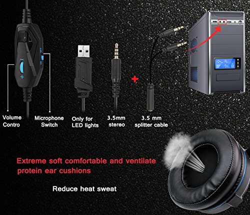 Ergonomic Desig: Super comfortable breathable cushion, breathable, high quality signature memory foam, no pressure, in the course of the game for the ultimate in comfort. Wire control connected to the left hand braided wire, 45 cm away from the headset, easy to control the volume and turn off the microphone. Adjustable steel slider can be adjusted according to different head size, suitable for men, women and children.