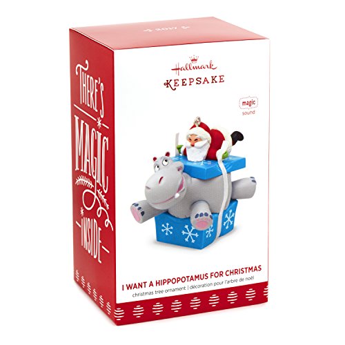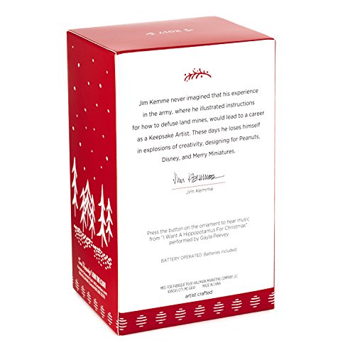 Press the button on the ornament to hear music from "I Want A Hippopotamus For Christmas" performed by Gayla Peevey. This Hallmark Keepsake Ornament measures 2.4 x 2.6 x 2.9 inches and comes in a 2.9 x 5 x 2.5 gift box.