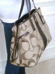 Light khaki Signature Sateen fabric, with leather trimmings, handles and centre design. Zip top closure. Embossed leather in the front design. Double straps with 8" drop. Coach hangtag plus Coach script charm. Interior has 1 zip pocket and 2 multipurpose pocket.
