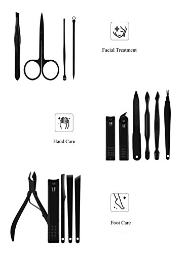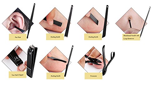 Product Description1x Larger Nail Clipper1x Smaller Nail Clipper1x Nail file1x Eyebrow tweezer1x Ear pick1x Scissors1x Acne needle3x Peeling knife1x Dead Skin Fork1x Exfoliating forceps1x Slanted edge Nail clipper1x Skin Knife1x Nail Cleaning Knife0