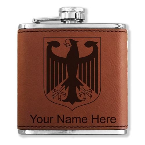 -. Brand : SkunkWerkz -. Color : Dark Brown -. EAN : 0648499656836 -. Feature : Flask is laser engraved with the image that you see in the photo. Your name or personalized message will be engraved below the image for FREE. / Measures 4.25" tall and 3.75" wide. Holds 6 fluid ounces / Constructed of stainless steel with a synthethic rawhide leather wrap. / You may have one line of engraved text - 20 characters maximum. / Click the "Customize Now" button to begin customizing your flask. -. ProductGroup : Kitchen -. ProductTypeName : KITCHEN -. Title : Faux Leather Flask - Coat of Arms Germany - Personalized Engraving Included (Dark Brown) -. UPC : 648499656836