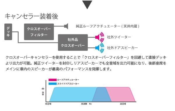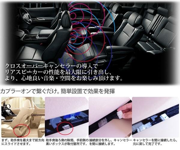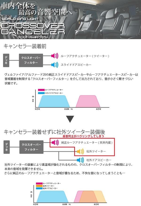| クロスオーバーキャンセラーの導入で、リアスピーカーの性能を最大限に引き出し、心地よい音楽空間をお楽しみ頂けます。20系アルファード/ヴェルファイアの8スピーカー仕様車の後部座席部分はスピーカーの音域・出力がクロスオーバーフィルターにより制限されており、音量が小さく抑えられています。このクロスオーバーキャンセラーではクロスオーバーフィルターでの制限を解消。リアスピーカーでも、全音域が出力可能になります。 |