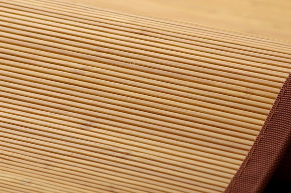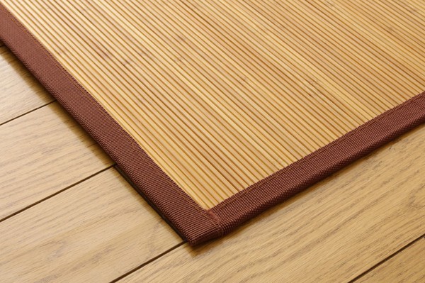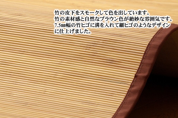 シンプルな糸無しの張り付けタイプです。素材は皮下7.5mm幅竹ヒゴを使用しています。竹の皮下部分は汚れにくく、耐久性に優れ、熱伝導率が高いため、ひんやり感も抜群です。素材の7.5mm幅の真ん中にの溝を入れて細ひごのようなデザインにしております。ゴザのような心地良い踏み心地に仕上げました。スモークすることで色を出しています。染料、顔料は使用していません。竹は他の木材と比べると格段に成長が早く(3~5年で成竹)、持続的生産が可能な環境に優しいサスティナブルな素材です。