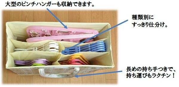 種類別に仕分けができるように仕切りがあり、大型のピンチハンガーも収納できます。持ち手が長めですので、持ち運びも楽々です。 |