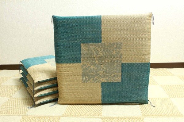 職人が1枚1枚手作業で捺染プリントを施したイ草座布団です。メセキ織という技法で柔らかい肌感触に仕上げました。またイ草の生地を縫製した後に、生地を湿らせ、裏返しにする『返し』という技法で仕上げております。イ草を通常曲げてはいけない方向に曲げますので、良い(太く強い)イ草でなければ作ることができません。返すことにより、ふっくらしたボリューム感を出しました。国産(九州産)のい草を使用しています。一本一本が太く、表皮が厚く繊維がキメ細かいので弾力性があり、耐久性に優れています。い草には空気の自然浄化作用、湿度の調節作用などがあります。また汚れにくく、使用するうちに黄金色に変化し味が出ます。い草に青森ヒバ加工を施しています(抗菌、防臭効果)。中材はウレタンをフェルトでサンドした三層構造で、適度なクッション性があります。※柄のプリントは職人が手作業で描く為、同じ色・柄であっても多少風合いが異なります。