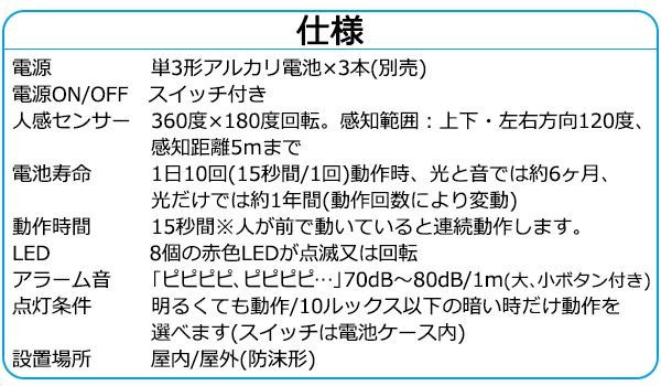 人の動きを感知すると赤いLEDが回転、または点滅し、アラーム音が15秒鳴ります。安全対策や、防犯対策、盗難防止はもちろん、店舗の客寄せ、畑などの害獣対策にもお使いいただけます。方向可変センサー搭載なので、狙った方向を感知することが可能!!様々な場所に簡単に取付けできます。 |