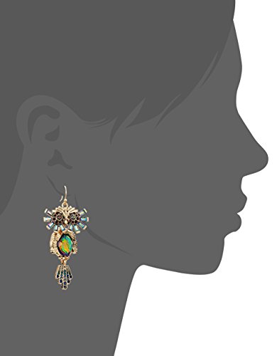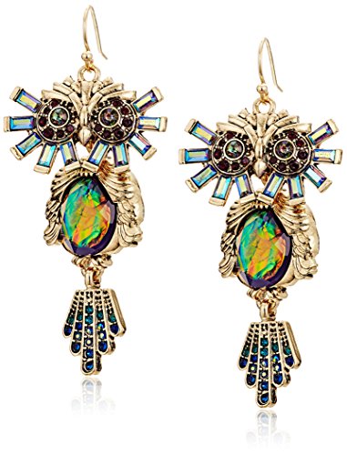 gold tone drop earrings with a colorful owl featuring opal tone stones, blue tonal and pink tonal faceted stones