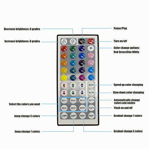 - REMOTE CONTROL MODE : You can DIY the colors you want with 44-key remote controller,press "DIY" button and then just long press one of the arrow buttons to set it up .Also it have dimming and brightness control, which is Extremely suitable for indoor and outdoor lighting . Such as kitchens, cabinets, restaurants, bedrooms, gardens, courtyards, balconies, banquets, weddings, etc..