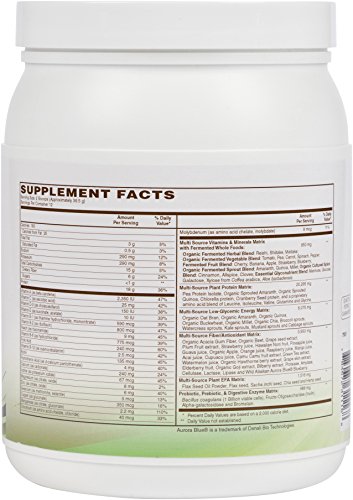 It features organic fermented whole foods, five unique plant proteins, five organic super grains, omega 3-6-9, 1 billion viable cells of highly-stable Bacillus coagulans probiotic, prebiotic, digestive enzymes, and 25 fruits, berries, vegetables, and herbs. It is a high-protein, low-fat, and low-glycemic way to supplement or replace a meal. And it is packed with much more nutrition than a typical meal.