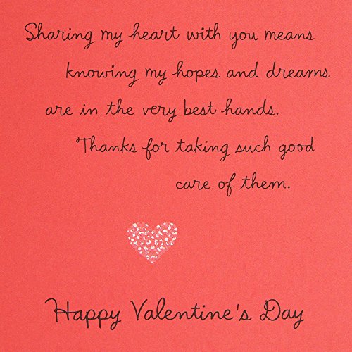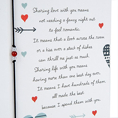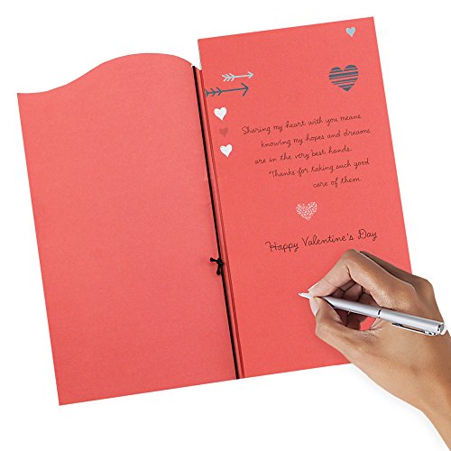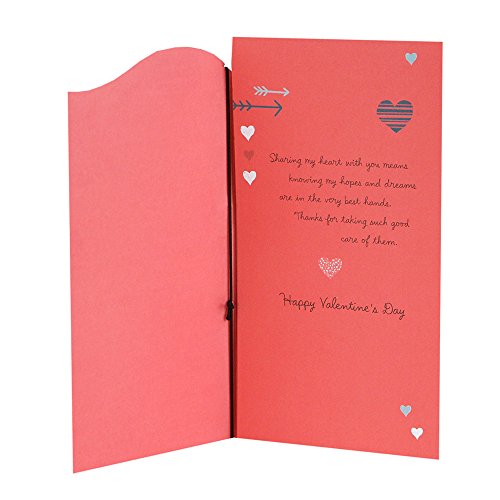 ReleaseDate : 2017-01-20 Studio : Hallmark Marketing Company, LLC Publisher : Hallmark Marketing Company, LLC Binding : Office Product Product Description Send a love note to your significant other this Valentine's Day with this card featuring illustrated hearts in different sizes, colors, and designs with arrows. The message on the front of the card reads, "Sharing love with you means not needing a fancy night out to feel romantic. It means that a look across the room or a kiss over a stack of dishes can thrill me just as much. Sharing life with you means having more than one best day ever. It means I have hundreds of them, all made the best because I spend them with you.” Open the card to reveal the inside message, "Sharing my heart with you means knowing my hopes and dreams are in the very best hands. Thanks for taking such good care of them." The card measures 8.3 inches long by 4.5 inches wide made with high quality cardstock paper; an envelope is included. All Hallmark cards are made with paper from well-managed forests. Hallmark was founded in 1910 when 18-year-old J.C. Hall arrived in Kansas City, Missouri, with a couple of shoeboxes of postcards under his arm and the American dream in his heart. Hallmark greeting cards are sold online and in nearly 40,000 retail stores across the globe and people continue to recognize the iconic Hallmark brand as "the very best." 0