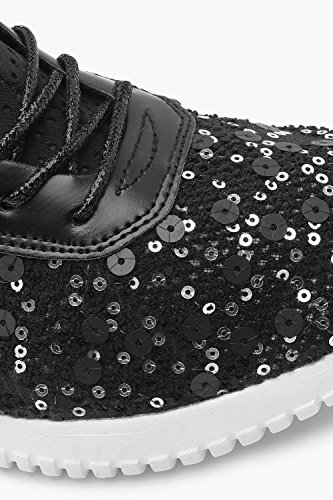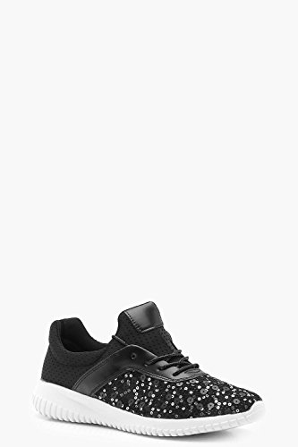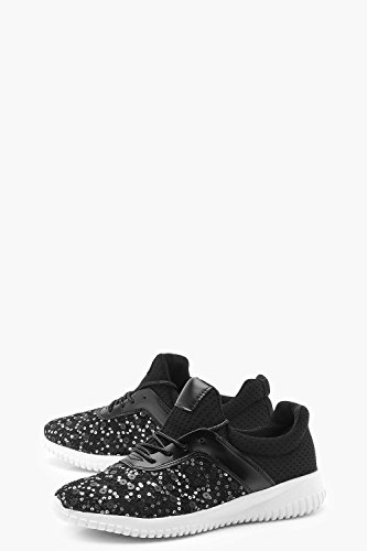 Boohoo Womens Lexi Sequin Lace Up Sports Trainer in Black size 8
