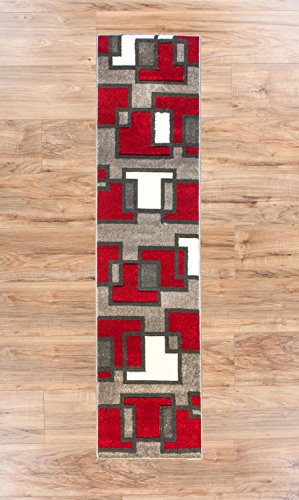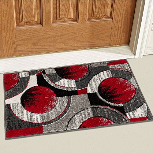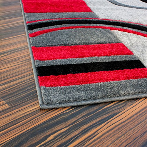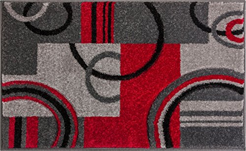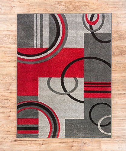 Echo Shapes and Circles brings a uniquely modern, multicolor perspective to your home. Like ripples in a pond, red, grey and black rings spread out among grey and red boxes. The abstract geometric pattern and vibrant colors are perfect for the active modern space. The air twisted polypropylene fiber gives a super plush 0.5" pile that is soft, stain resistant, and doesn't shed or fade over time. The 100% jute backing is safe for wood floors and all four sides of the rug are serged for improved durability.Feature