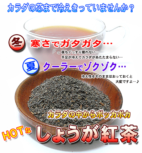 | 寒い気候になってくるとカラダが冷えて、なかなか暖まらずに寝つけない事や短時間でカラダの芯まで冷え切って体も思うように動かなくなっていませんか?そのような方に芯まで温まってくる紅茶をお薦めします。また、風邪のひきはじめの方にもお薦めです。寝る時にもカラダの芯から温まり、深い眠りに誘ってくれるでしょう。 |