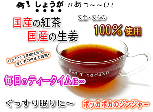 | エコファーマーが栽培した大分県産の手作り紅茶に、高知や鹿児島などの国内産しょうがパウダーをブレンドした国産のしょうが紅茶。 |