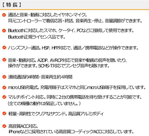 通話と音楽・動画に対応したイヤホンマイク。耳元コントローラーで着信応答・終話、音楽再生・停止、音量調節ができます。Bluetoothに対応したスマホ、ケータイ、PCなどに接続して使用できます。Bluetooth正規ライセンス。高品質なアルミボディ!!ハウンジング部にマグネット内蔵で結合してネックレスのように装着できるのもオシャレです♪ |