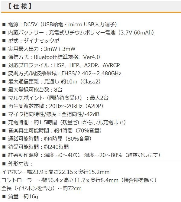 | 付属品 | 充電用microUSBケーブル、イヤーチップ(S、M、L)、取扱説明書、保証書(保証期間12ヶ月) |