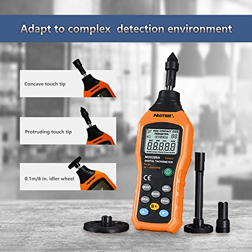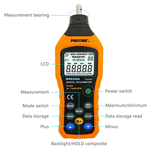 - PROTMEX MS6208A is a contact-type digital tachometer with stable performance, high reliability and high safety performance, CE ROHS Certification.