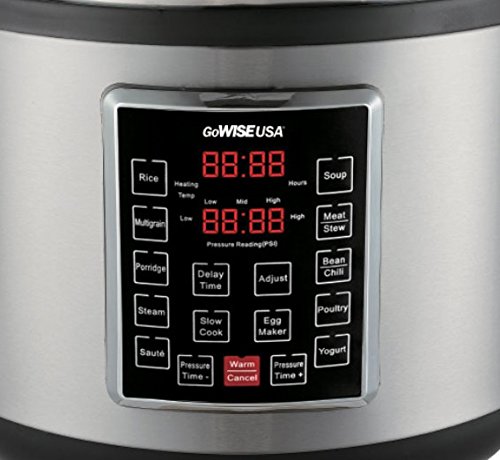 The GoWISE USA 14-Quart 10-in-1 Pressure Cooker/Slow Cooker includes a removable and durable ceramic coated cooking pot, heating plate for rice, rice scooper and measuring cup. This outer body is stainless-steel with cool touch handles. The gasket sealed lid is self-locking. 10 Presets help making cooking easier. Steam, Rice, Multigrain, Porridge, Saute, Soup, Meat/Stew, Bean/Chili, Poultry and Yogurt. Functions include Auto Keep-Warm, Slow Cook and Timer for up to 20-hrs with a 24-hr Delay.Feature