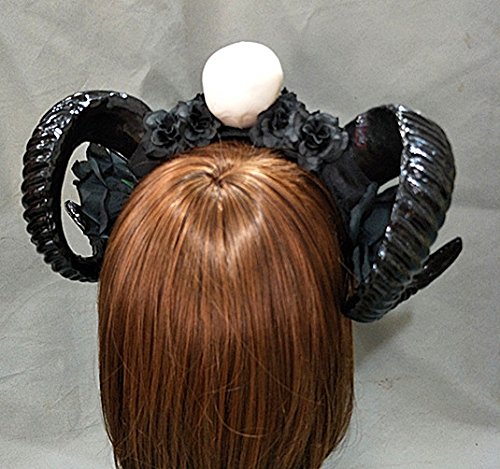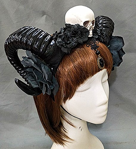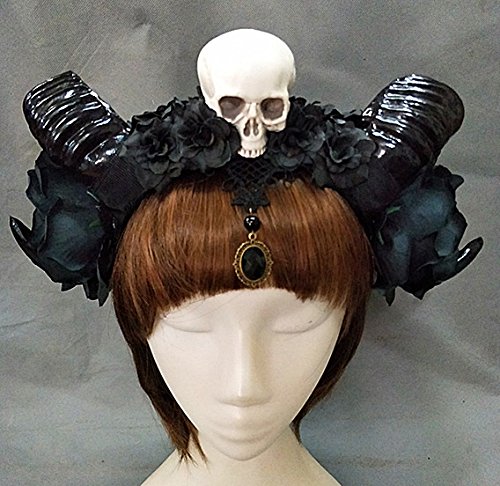 Qhome Gothic Skull Black Rose Gauze Sheep Horn Hoop Headband Forest Animal Photography Original Manual Aries Exhibition Cosplay Photo Props Deluxe...