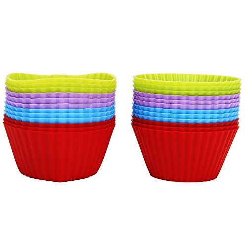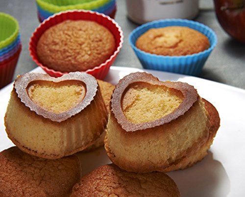 - TOTAL 24 CUPS - 12 heart-shaped silicone baking cups & 12 round silicone baking cups packed in one set, double FUN in your kitchen. Each type of cups includes 4 rainbow colors (Red/Purple/Blue/Yellow), your kids would love our baking cups too.