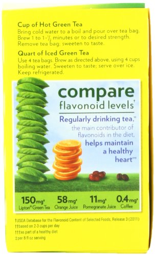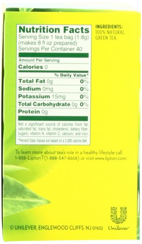 -. Binding : Grocery -. Brand : Lipton -. EAN : 0041000077210 -. Feature : Pure and simple and made from the finest tea leaves from around the world / Pack of six 40-count tea bag boxes (total 240 tea bags) / Contains 150 mg of flavonoids per 8 fluid ounce serving, is 100% natural, no preservatives or coloring / LIPTON® green tea is characterized by a delicate, clean taste, subtle aroma, and a beautiful pale green color / Enjoy this green tea hot or iced, and make it a part of your daily routine -. IsAdultProduct : 0 -. Label : Lipton -. Manufacturer : Lipton -. Model : 10041000077217 -. NumberOfItems : 6 -. PackageQuantity : 6 -. ProductGroup : Grocery -. ProductTypeName : GROCERY -. PublicationDate : 2010-10-13 -. Publisher : Lipton -. Studio : Lipton -. Title : Lipton Green Tea Bags, 40 ct (Pack of 6) -. UPC : 041000077210