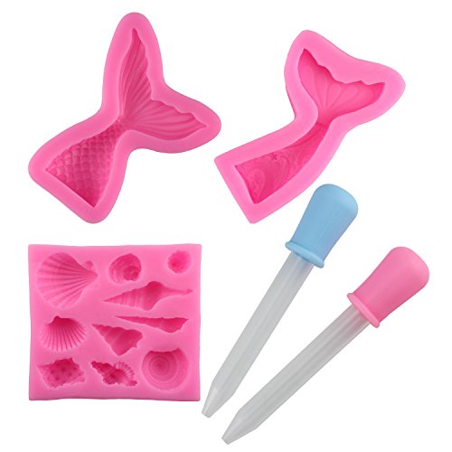 Mujiang Mermaid Tail Silicone Fondant Molds Seashell Starfish Sugar Chocolate Candy Molds with 2 Droppers, (Set of 5)