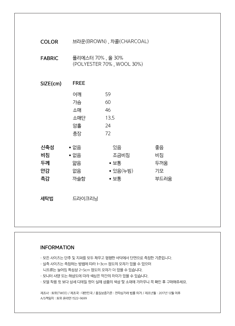 울30% 블랜딩 ?단으로 보온성을 높여주었고