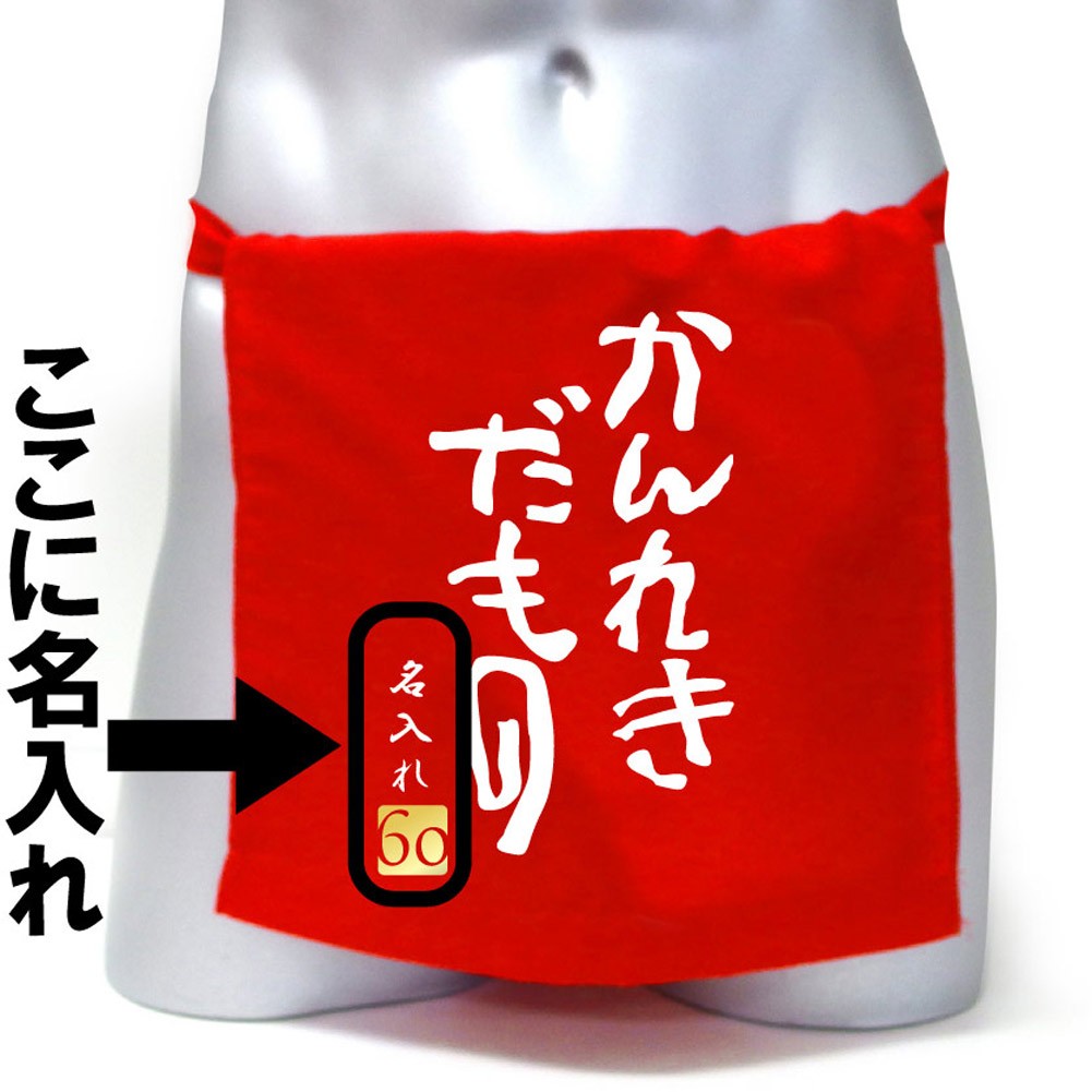 「かんれきだもの」デザインが最高!シャレもんオリジナル還暦祝い用フンドシです。もっともオーソドックスな昔からあるふんどしの形状です。フリーサイズです。なんと、この価格でお名前を名入れします!!名前の文字は白文字、書体は筆文字となります。文字数は8文字(ひらがな・カタカナ・漢字)まで名入れいたします。他にも還暦プレゼント用のTシャツやパンツ、エプロンや帽子など還暦お祝い商品が数十種ありますので、当店シャレもんの還暦コーナーをご覧ください。きっと、笑顔になる還暦祝いはシャレもん!!
