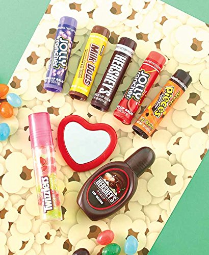 -. Feature : Giftable popcorn bucket package / Hershey's set includes: / 5 Lip balms, 0.12 oz., each Roller gloss, 0.14 oz.. Squeeze gloss, 0.32 oz.. / Gloss pot, 0.18 oz. Heart mirror, 2"W x 1-3/4"L / Plastic, For ages 4 and up
