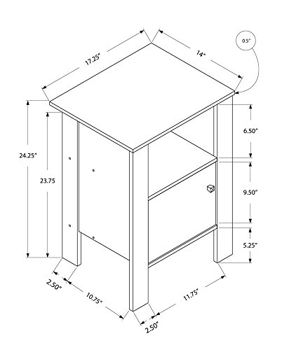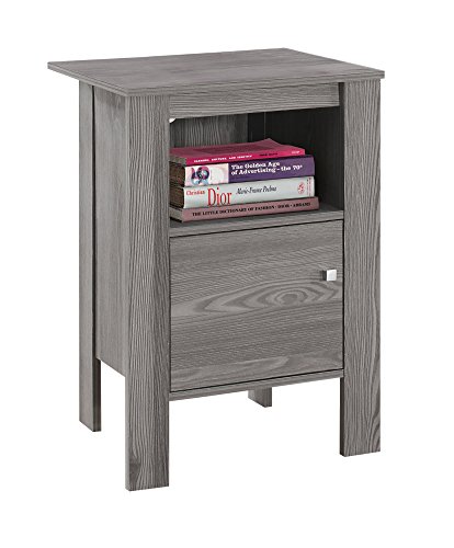 Studio : Monarch Specialties Publisher : Monarch Specialties Binding : Kitchen Product Description Enhance your living space with this simple and elegant multifunctional rectangular accent table. Finished in a sophisticated grey, it can easily fit in a living room, family room or den as a convient end/side table or in a bedroom as a handy night stand. The spacious table top can hold a small lamp and pictures while the open shelf space is perfect to place books, magazines, or accessories. The closed bottom cabinet accented with a simple square silver knob, offers additional storage capacity. With sturdy square legs and included floor protectors, this transitional style accent table will provide years of enjoyment no matter where you place it in your home. 0