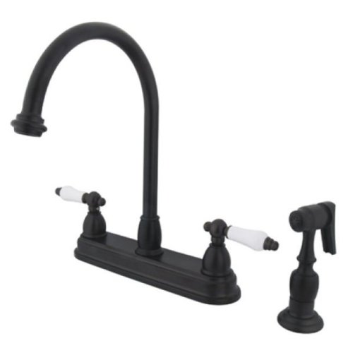 Kingston Brass KB3755PLBS Deck Mount 8-Inch Center Kitchen Faucet, Porcelain Handle with Brass Sprayer, Oil Rubbed Bronze