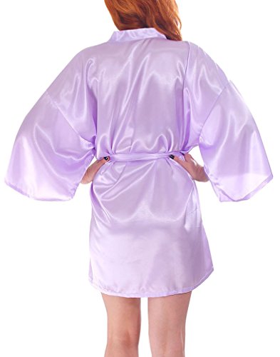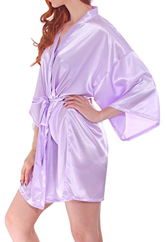 Women Solid Color Satin Kimono Robe Short Sleeve Silk Bridal Robe, Light Purple
