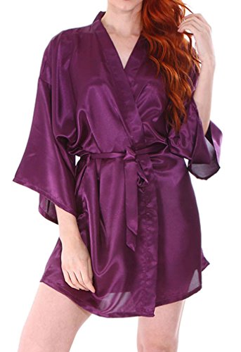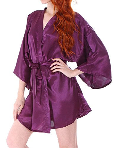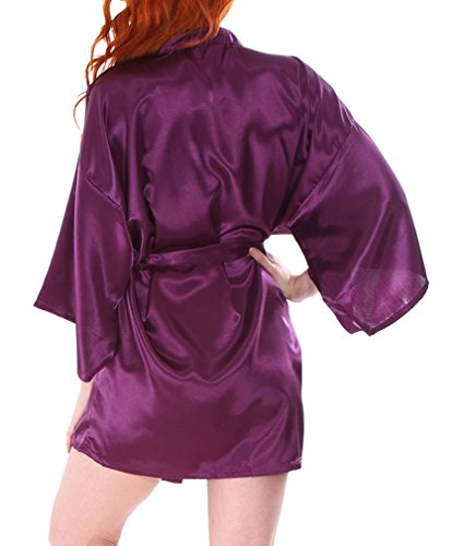 Women's Solid Color Satin Kimono Robe Short Sleeve Silk Bridal Robe, Dark Purple