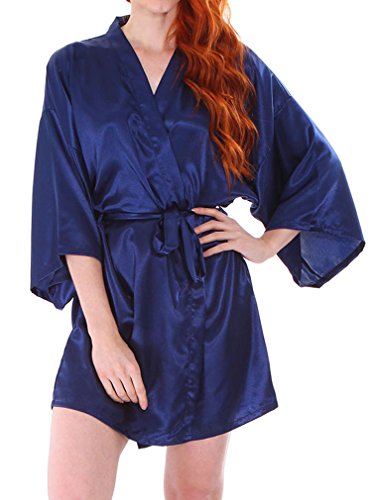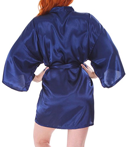 Women's Solid Color Satin Kimono Robe Short Sleeve Silk Bridal Robe, Dark Blue