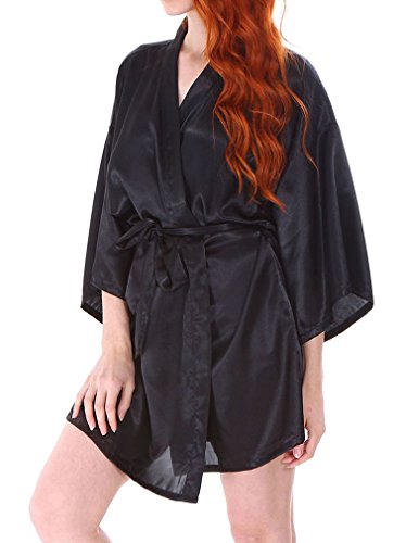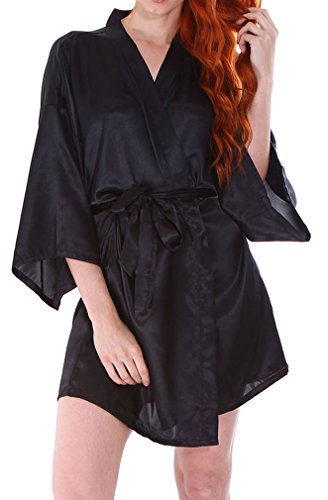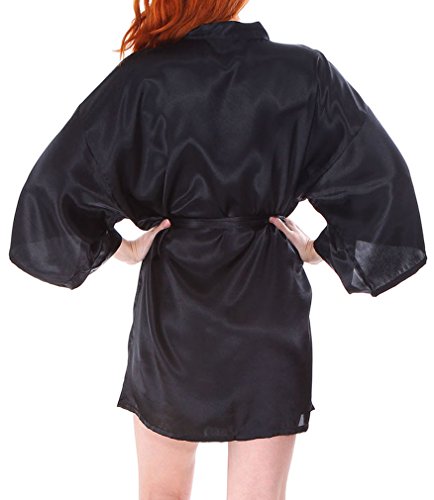 Women's Solid Color Satin Kimono Robe Short Sleeve Silk Bridal Robe, Black