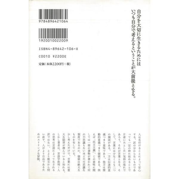 【商品説明】 定価(税込み):2,376円 値引き:10% OFF 少し考えただけで、言葉には重大な陥穽が潜んでいると知れる。しかし著者は、言語学批判=人の思考は言語によってなされる訳ではない、とより根元から問い直す。人がより自由であるためのスリリングな冒険。 バーゲンブック 新品 特価 格安 語学 辞書 語学読み物 エッセイ 読み物 |