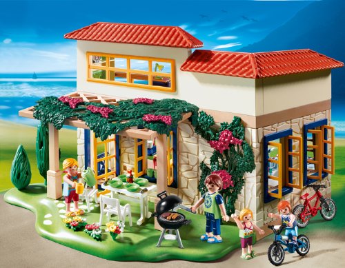 -. Feature : Life is carefree at the Playmobil Summer House / Rooms include kitchen, bathroom, and bedroom, making it the perfect getaway for a family of four / The pretty terrace decorated with plants has patio furniture and a grill for barbecues / Figures can bend, sit, stand and turn their heads / Set also comes with four figures and many other accessories