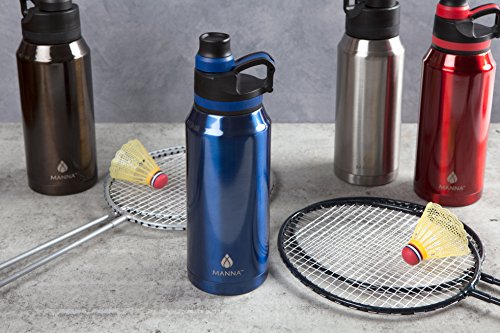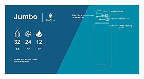 PREMIUM VACUUM INSULATION TECHNOLOGY - The Manna Jumbo water bottle is the solution to preventing iced water getting warm and hot coffee cool off. Made from premium food grade 18/8 stainless steel, your drink can stay piping hot up to 8 hours or icy cool up to 12 hours.