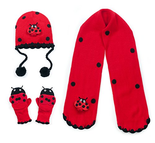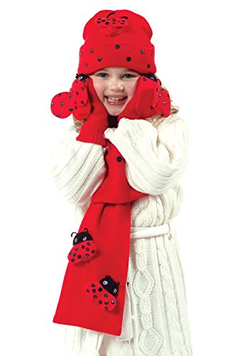 Kidorable Red Ladybug Soft Hat/Scarf/Mitten Set for Girls With Fun Wings and Antennae, Ages 3-5